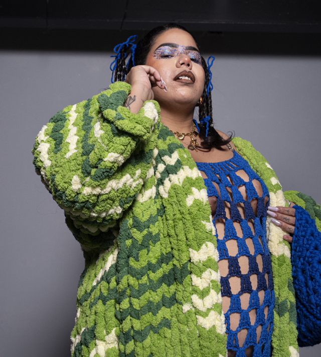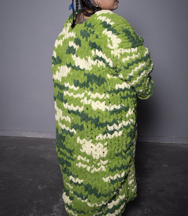 Manteau réalisé à partir de pelotes de seconde main.